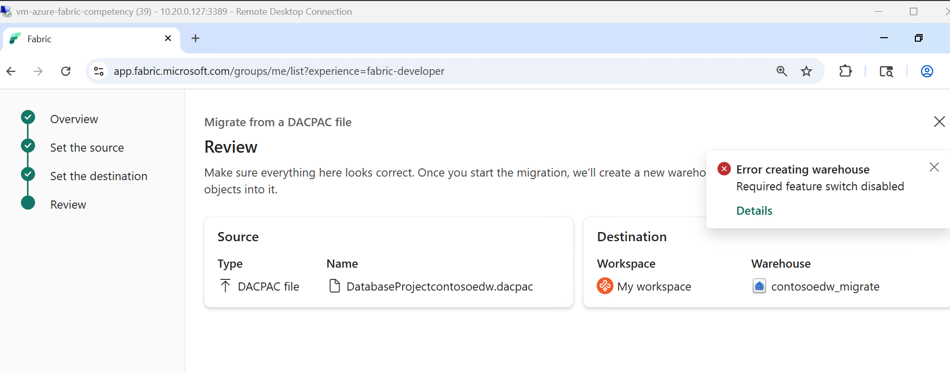 The error message “Required feature switch disabled” means that the issue is related to a Fabric tenant-level setting, not your DACPAC file. When performing a migration, Fabric needs to create a new Data Warehouse as the target. If the Fabric admin switch is turned off, users are unable to create new Fabric objects like Warehouses or Lakehouses, resulting in this error. To fix this, your Fabric (Power BI) Admin should enable the Fabric feature switch in the Admin Portal.