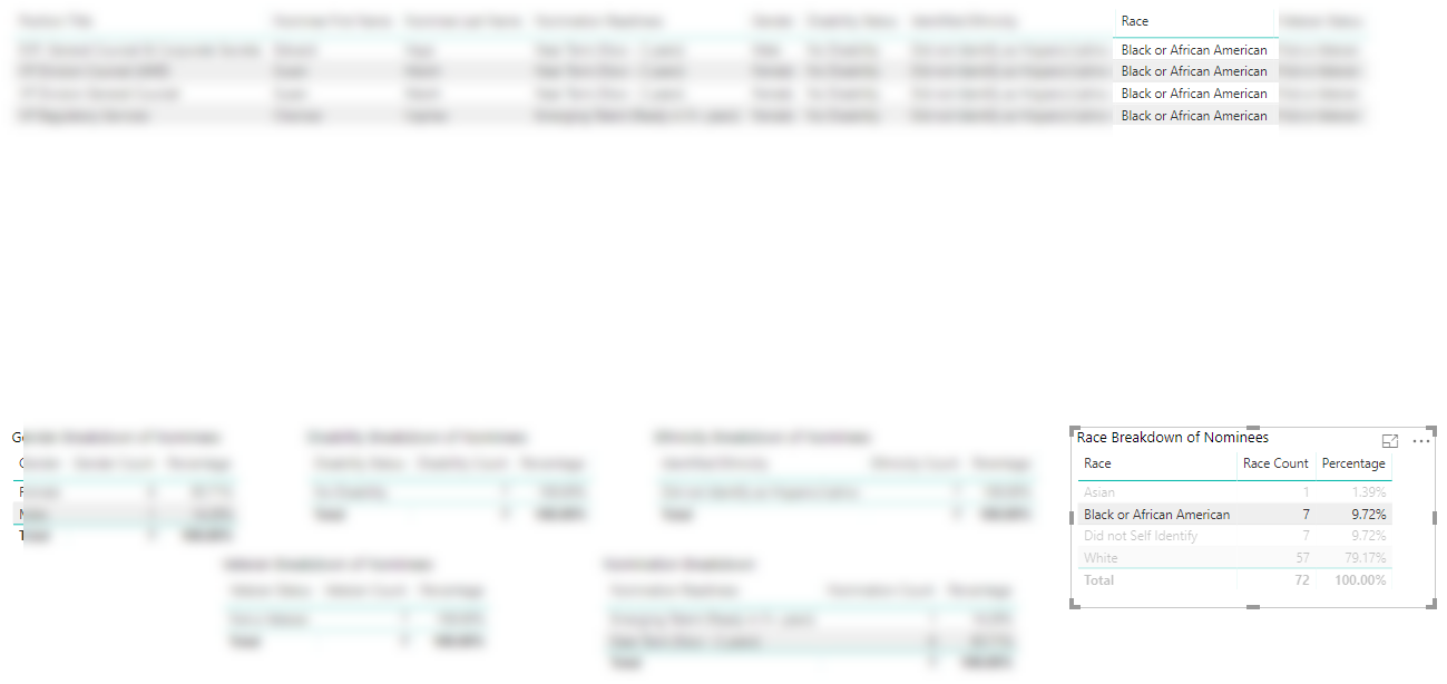 I am currently creating an HR Dashboard. When I click the racial graph at the bottom it gives me the wrong total count. The graph at the top still shows the correct total amount though. Why is this happening?