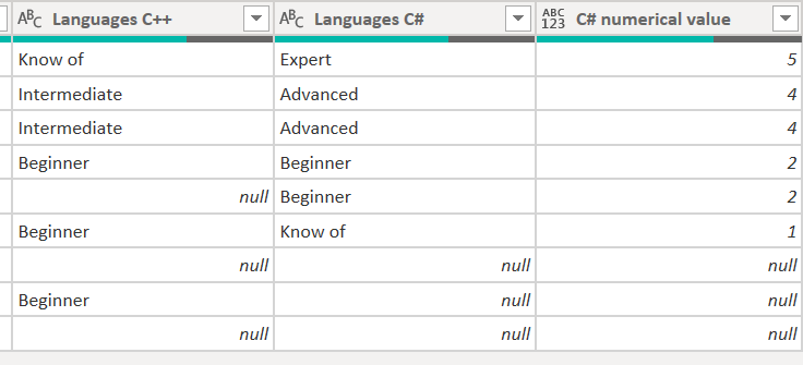 #"Added Conditional Column" = Table.AddColumn(#"Uppercased Text", "Rank", each if Text.Contains([Value], "KNOW OF") then 1 else if Text.Contains([Value], "BEGINNER") then 2 else if Text.Contains([Value], "INTERMEDIATE") then 3 else if Text.Contains([Value], "ADVANCED") then 4 else if Text.Contains([Value], "EXPERT") then 5 else null),