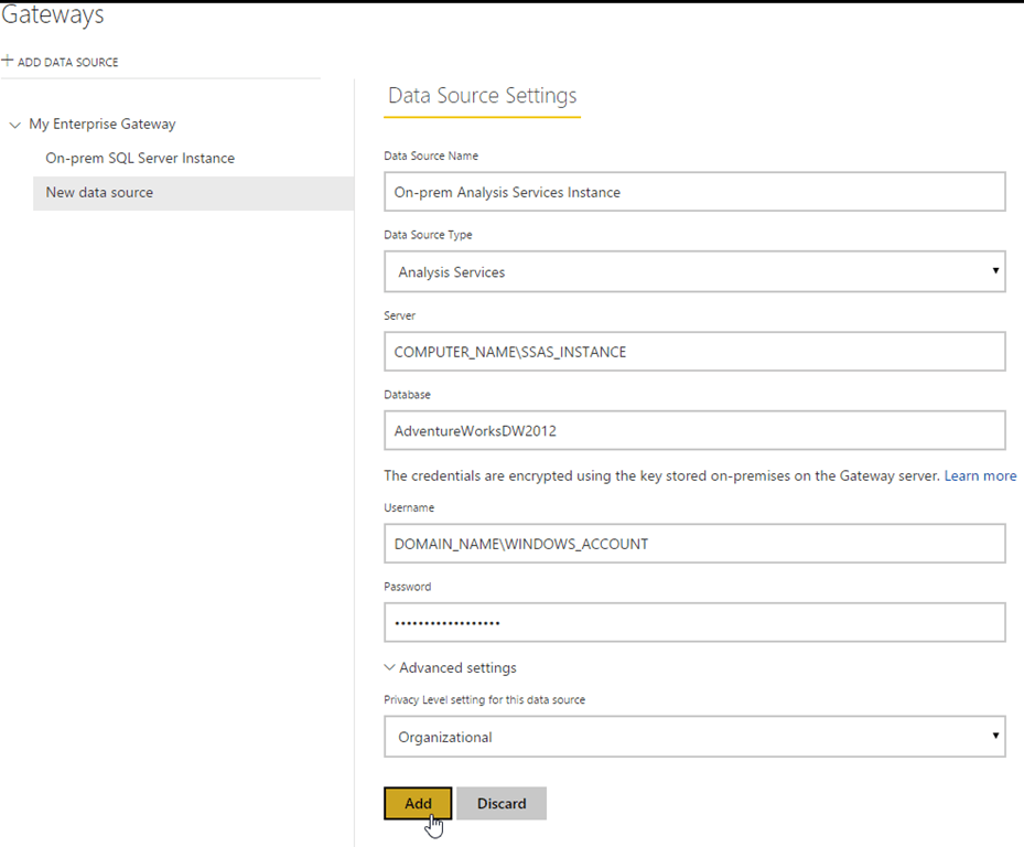 When you create a data source in the Gateway it appears that the privacy setting cannot be modified and needs to be re-created and have the new privacy setting applied in that way.